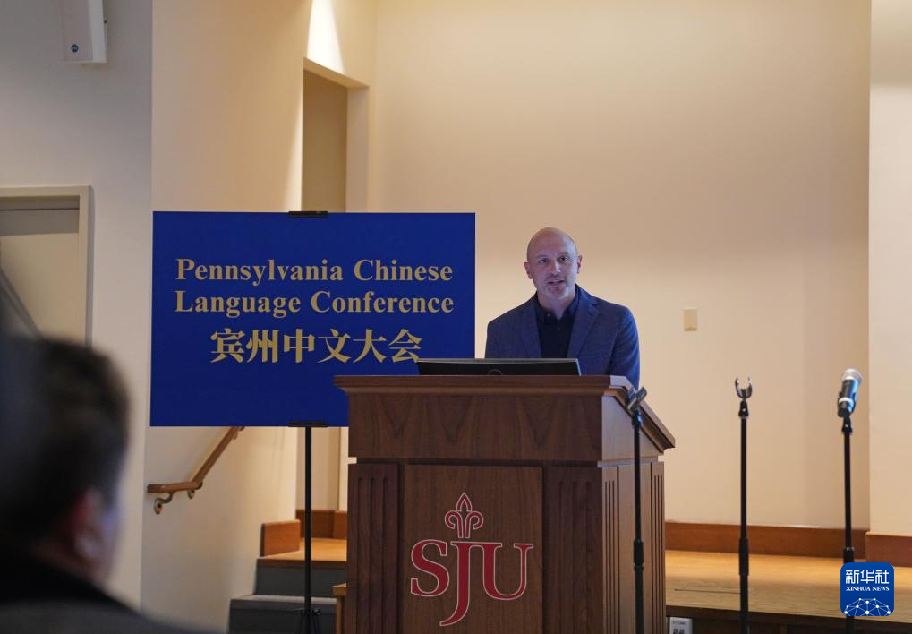 12月6日,在美国费城的圣约瑟夫大学,该校副教务长兼教育与人类发展学院院长乔书亚·鲍尔在美国宾夕法尼亚州首届中文大会上发言。新华社记者 张凤国 摄