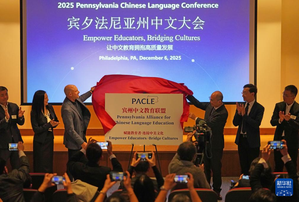 12月6日,在美国费城的圣约瑟夫大学,嘉宾在美国宾夕法尼亚州首届中文大会上为宾州中文教育联盟揭牌。新华社记者 张凤国 摄