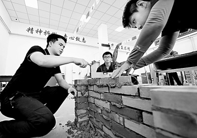 在天津铁道职业技术学院砌筑集训基地,特级技师、全国技术能手伍远州指导学生实践。新华社发