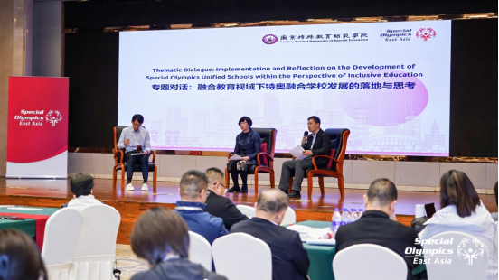 在主题分享环节,行业专家与一线实践者轮番登场,带来了极具参考价值的经验分享。特奥东亚区组织发展部副总裁曹忆菊以全局视角,全面梳理特奥全球融合学校计划的发展脉络,从国际实践层面为参会者搭建了宏观认知框架。美国西北大学教育与社会政策学院副教授尹路通过在美国实施的特奥融合示范学校与学生学业及行为表现的关系研究分享了最新数据成果。南京特师体育学院主持工作副院长金梅立足本校特教特色,分享了学校在融合课程开发、特色活动设计中的创新探索。蒙古国特奥融合学校甘努尔学校教师敖特根苏荣、韩国特奥融合学校吾信高中教师郭贤哲则结合各自地区的文化背景与教育实际,介绍了融合学校建设中的本土化经验,展现了不同地区在课程设计、活动开展、家校协同等方面的多元创新做法,为跨区域经验互鉴提供了丰富素材。